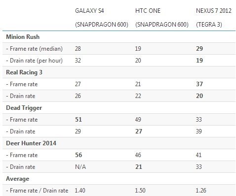 此前的綜合測試中,三星Galaxy S4由於電池容量更大,相比HTC One擁有更好的續航能力,而在此次游戲測試比拼中,結果依然是這樣,尤其是在賽車等游戲中,HTC One的表現更差一些。