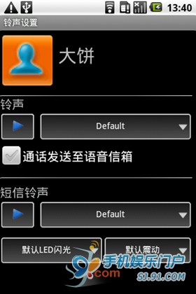 運行軟件後,我們會發現主界面分為默認和聯系人兩個標簽,默認標簽下可以設置基本的鈴聲和短信鈴聲,點擊下拉框,首次運行可能會有確認提示,直接點確認跳過。
