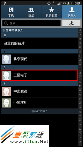 2.點擊存儲在手機上的某個聯系人(這裡以“三星電子”為例)。