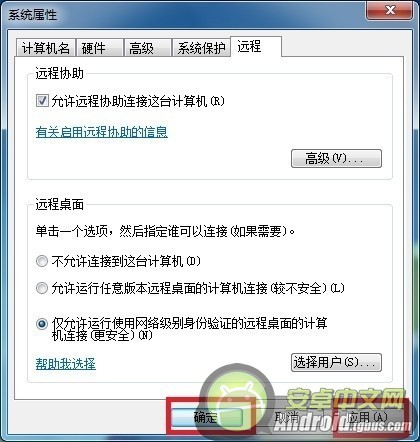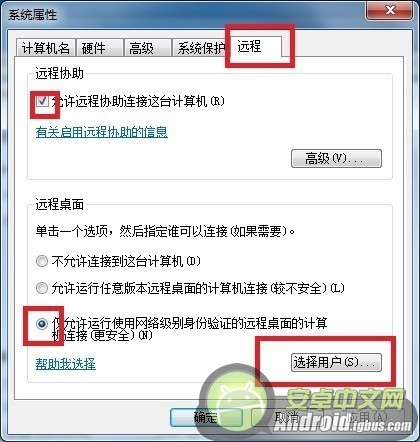 3.在點擊遠程,在允許遠程協助連接這台計算機打上對號,下面選擇僅允許運行使用網絡級別身份驗證的遠程桌面的計算機連接,再點擊“選擇用戶”,如下圖所示: