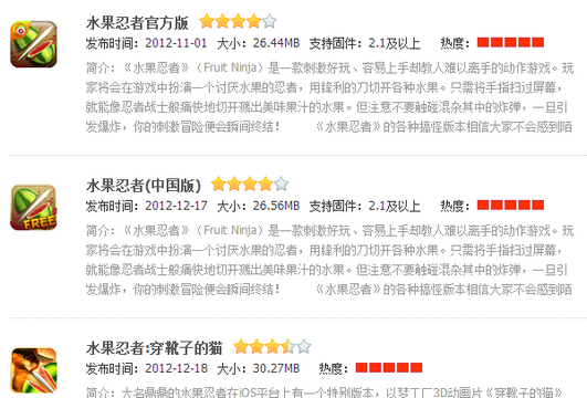 應用體積這一點許多人可能會忽視,某些應用的體積會比正常情況下要小。舉個例子,低於1M的水果忍者游戲無論如何也是有問題的,因為1M的容量裝不下那麼豐富的內容。多浏覽幾個應用市場自然就明白了。