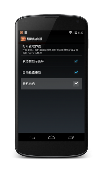 fqrouter2 是一把聰明的梯子,通過它你可以便捷地訪問牆外的世界。雖然FQ應用遍地都是,但它最大的優點在於簡單快捷,一經安裝即能為你所用,應用需要 ROOT 權限。打開 fqrouter2,向右滑動,點擊右上角的“更多”按鈕進入設置界面,勾選“開機啟動”選項。設置完畢後,fqrouter2 便會在你每次重啟手機後都自動為你搭起通往牆外的梯子,無需繁瑣的手動打開。