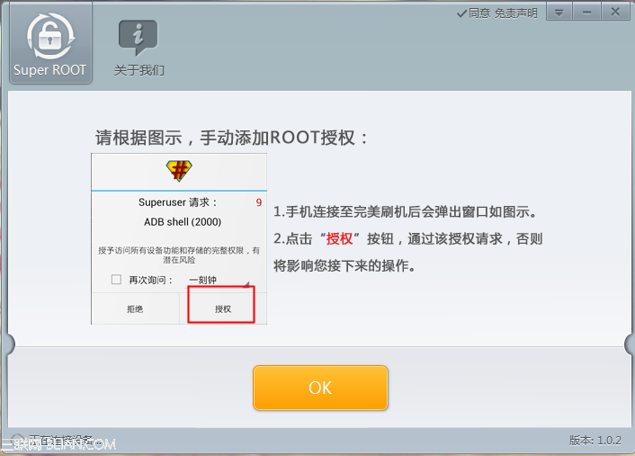 三星i9128v root教程提醒大家:root成功後,在手機界面出現Superuser請求時,點擊“授權”選項,手動添加三星i9128v root權限!而且完美ROOT針對三星i9128v root成功後系統不穩定,或是root權限不完整的情況,推出移除ROOT以及重新ROOT功能。
