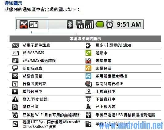 通知圖示會在收到新訊息、設定了行事歷行程、鬧鐘,以及啟動來電轉接等持續性設定時顯示,同時也會顯示目前的通話狀態。您可以開啟通知面板,以開啟訊息、提醒或行程通知,以及檢視電信業者的名稱。