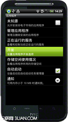 3.進入“應用程序”界面後找到“開發”選項,選擇進入後勾選USB調試選項即可