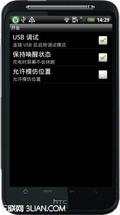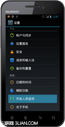 Android 4.0的打開方式有所不同,同樣的方法進入設置界面後找到“開發人員選項”, 選擇進入後並勾選 USB調試