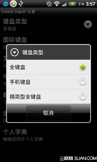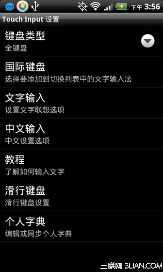 先來教大家如何設置傳統鍵盤,在輸入法選擇界面選擇【Touch Input】選項,可以看到有【鍵盤類型】一項,選擇【鍵盤類型】,裡面的【手機鍵盤】和【精簡全鍵盤】都是傳統的16鍵鍵盤。如下圖