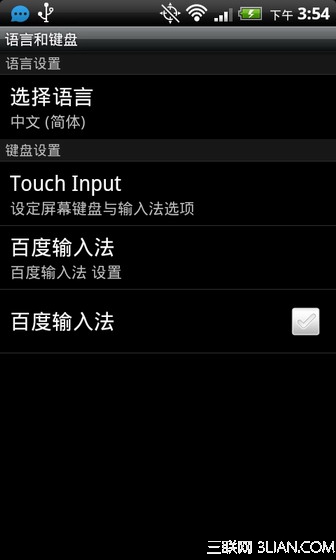 系統自帶的輸入法一般默認都是全鍵盤的,也就是大家平時說的QWERTY鍵盤,想要設置為傳統的按鍵鍵盤的話則需要一些設置,這個跟新裝了輸入法之後的設置類似,所以我們把2個操作放在一起講。現在比較好用的輸入法有百度輸入法、搜狗輸入法等,還有可以語音輸入的訊飛語音輸入法。這裡以百度輸入法為例講解,安裝百度輸入法,安裝好之後進設置(按menu鍵,選擇設置),選擇【語言和鍵盤】,然後會看到輸入法選擇的界面,如下圖