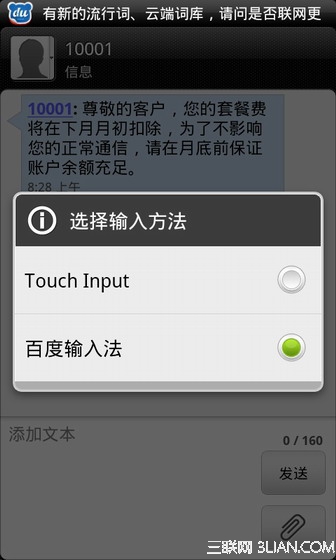選擇了百度輸入法後,我們還不能使用百度輸入法打字,還需要一步簡單的設置。進入到可以輸入的界面,例如短信,然後長按輸入框(大概3秒),然後松手,會看到有輸入法的提示,點擊輸入法,然後就可以看到我們剛才安裝的百度輸入法了,選擇百度輸入法,即可使用百度輸入法來打字了,如下圖