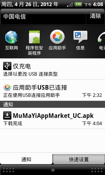下載之後我們可以看到在通知欄有一個下載的提示圖標,將通知欄向下拉,可以看到剛才下載的軟件,點擊安裝。