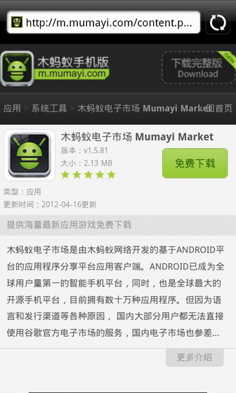 壁紙和鈴聲的設置我們都講過了,但是只有壁紙和鈴聲的話,那強大的安卓系統就有點大材小用了,智能手機多裝一些實用、奇趣的軟件和游戲是必須的,下面我們就給大家講解如何將軟件和游戲安裝到手機中。一般來講安裝軟件游戲有2種方式—— 一種是通過電腦安裝軟件到手機,一種是直接在手機端安裝。這裡我們先從手機端安裝開始,首先打開手機中的浏覽器,地址欄輸入m.mumayi.com,進入之後會看到有很多軟件游戲,下載自己喜歡的吧,如下圖;