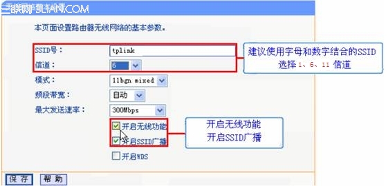 請通過網線將電腦和路由器相連,登錄路由器的管理界面,在無線設置---基本設置,確認SSID非中文,建議信道選1、6或11,無線功能已開啟,SSID廣播已開啟。點保存,並重啟路由器。如下圖示: