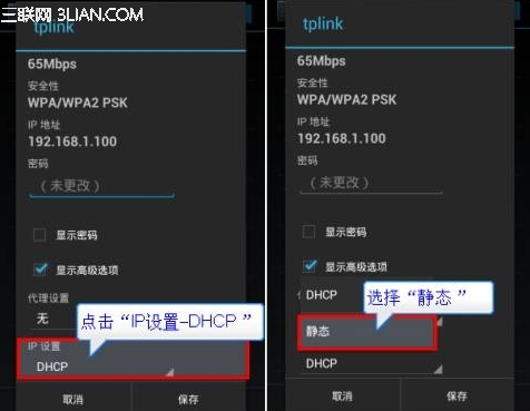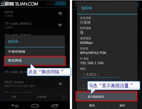 當無線終端的IP地址參數配置不正確,即使成功連接無線網絡也無法上網,可修改無線設備的網絡參數。長按對應無線路由器信號名稱,選擇修改網絡,勾選顯示高級選項。如下圖示: