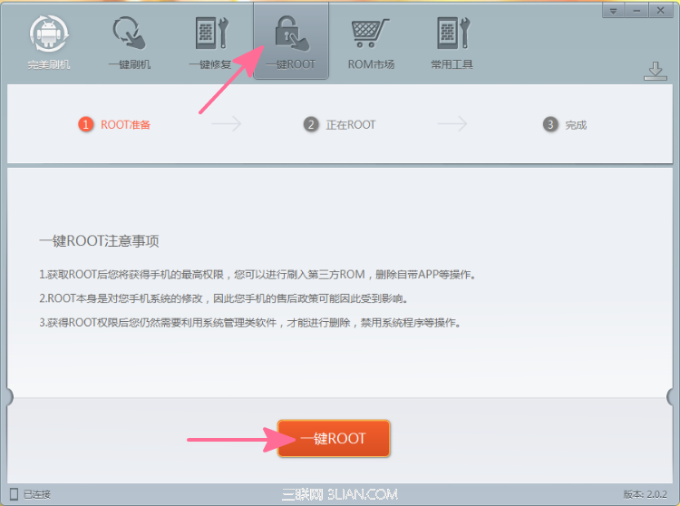 點擊軟件頁面上方的“一鍵root”按鈕,切換到root頁面,閱讀“一鍵root注意事項”,之後點擊“一鍵root”按鈕,軟件立即開始獲取 Google nexus4 4.3root權限!連續操作參照下面截圖。