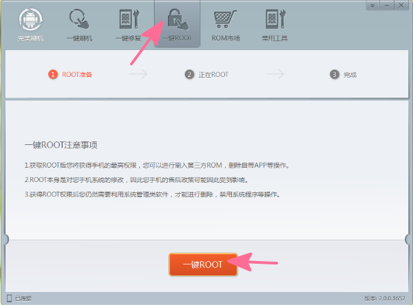 雙擊完美刷機圖標,啟動軟件,用數據線連接HTC g12和電腦,在確認軟件已經與手機成功連接後,切換到“一鍵root”頁面。