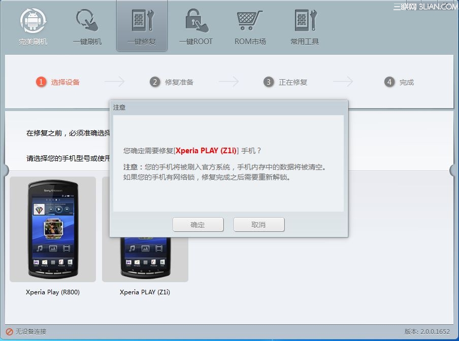 連接變磚手機和電腦,點擊一鍵修復,再選擇索尼系列手機開始修復,確認點擊確定按鈕即可。提示信息內容為:修復後的手機系統恢復到官方原始系統,內存中的數據已被清空,有網絡鎖的手機需要重新解鎖。