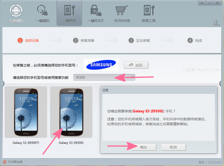 雙擊軟件圖標,啟動救磚工具,數據線連接三星i9300和電腦,按照三星Galaxy s3 i9300變磚修復教程繼續操作,下面點擊頁面上方或下方的“一鍵修復”按鈕均能進入救磚頁面。