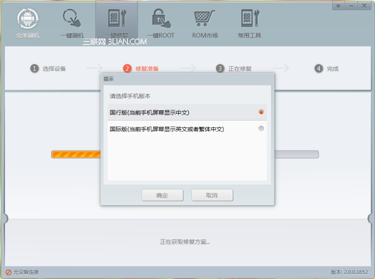 這時救磚工具會提示你選擇手機版本,操作這步要以手機進入“Warning”後屏幕顯示的語言為准,手機屏幕顯示簡體中文即為“國行版”,而手機屏幕顯示除簡體中文外的語言包括英文或繁體中文等等即為“國際版”。