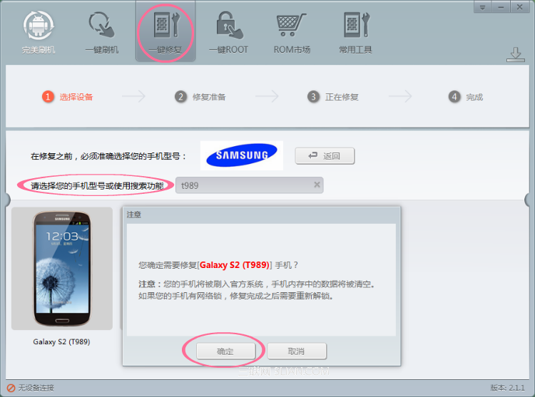 點選機型之後,彈出一個對話框,詢問你是否要進行三星t989救磚,選擇“確定”。