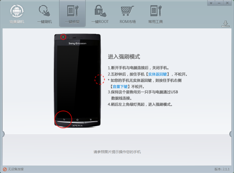 接下來軟件提示你手動進入索愛st15i救磚強刷模式,下文給出的截圖已經對這幾個操作做出明確指導!