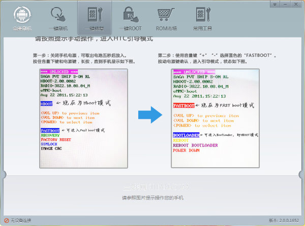 HTC g10救磚教程第三步,軟件提示需要手動進入引導模式,嚴格按照提示操作,下圖為步驟截圖。