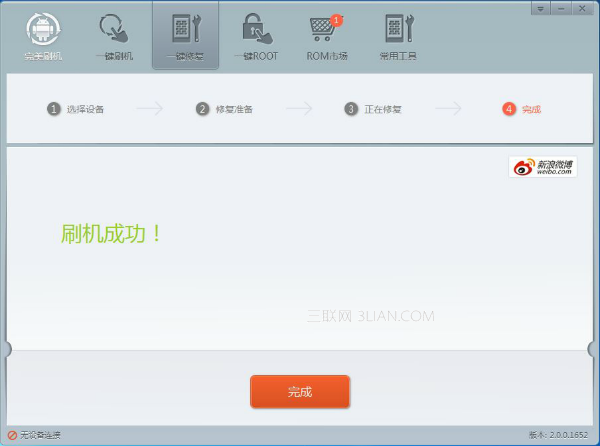 救磚工具條推進到“修復完成”,彈出“修復成功”頁面,這是HTC g10救磚教程終極步驟,點擊“完成”,接下來等待手機自動重啟。