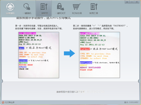 確認HTC t328d救磚後,彈出指導進入HTC引導模式的頁面,具體步驟參照下面的軟件截圖!