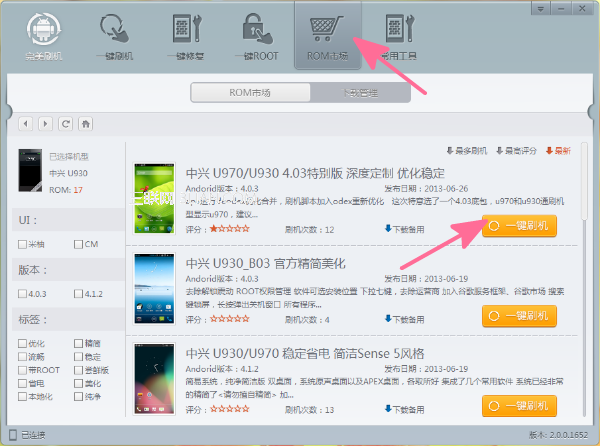 除此之外,你還可以直接點擊主頁面上方“rom市場”按鈕,搜索中意的中興u930刷機包下載刷機。