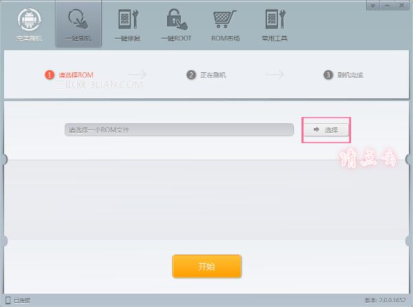 途徑二:如果刷機之前你就已經准備好中興v880刷機Rom包,請直接點擊主頁面的“一鍵刷機”按鈕,進入刷機頁面,點擊“選擇”,選定Rom包,點擊頁面下方的“打開”完成添加rom的操作,點擊刷機頁面“開始”按鈕,軟件立即運行中興v880刷機。