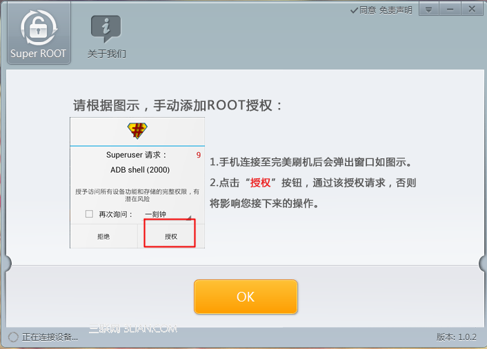 三星n7105一鍵root教程提醒:如果點擊“完成”後,軟件頁面出現需要手動添加三星n7105 root權限的提示,按照圖示操作即可,即手機界面出現Superuser請求時點擊“授權”選項。