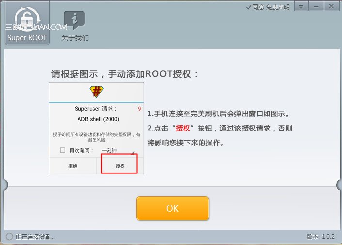如果你點擊“ROOT成功”頁面的“完成”按鈕後,軟件出現需要手動添加三星i9250 root權限的提示,請按照提示操作即可,即手機界面出現Superuser請求時點擊“授權”選項!見下圖。