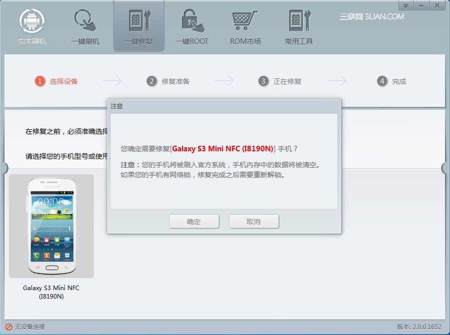 連上手機和電腦,打開完美刷機變磚修復界面,以三星I8190救磚為例,為機友分享教程內容。選擇三星品牌救磚,再選擇I8190這款機型。點擊確定,軟件就開始工作了。