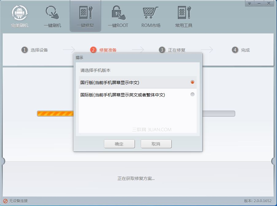 首先要看清楚手機在修復模式時屏幕所顯示的內容,若顯示繁體或英文,如提示所說,選擇國際版本,若顯示簡體中文,選擇國行版本。選擇完畢,點擊確定。千萬不要因為手誤點錯,以免出現不必要的錯誤。