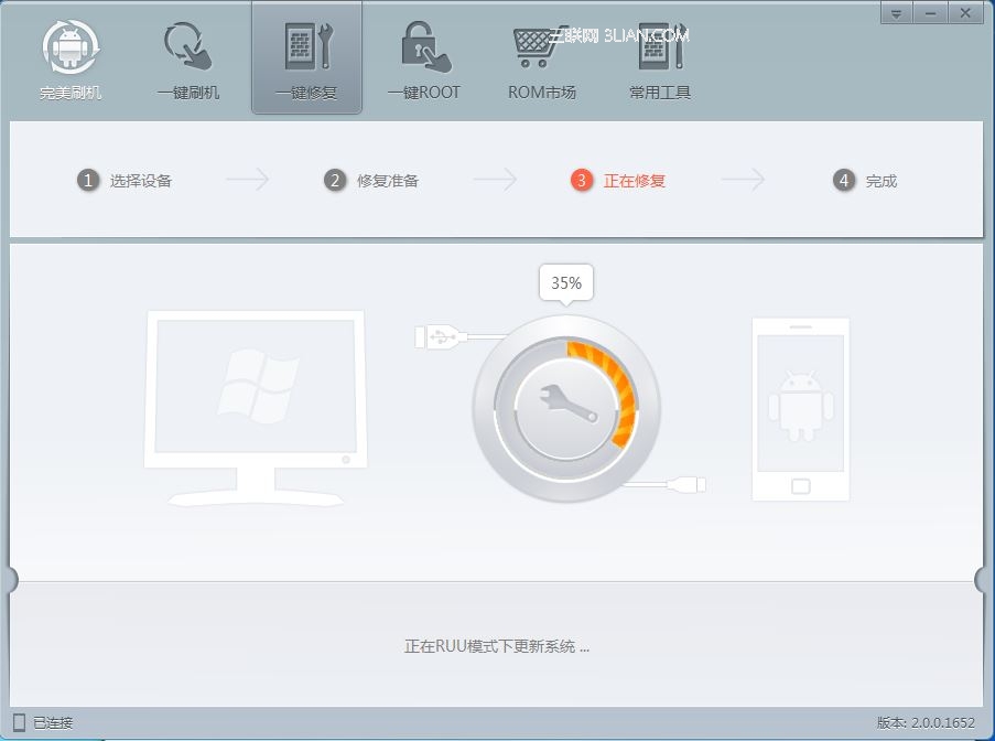 需要持續5-10分鐘,在這中間要確保數據線的連接完好,同時注意觀察手機的狀態,在程序運行到100%時,手機開始重新啟動開機,等待開機後,方可操作手機。最後點擊完成,關閉軟件。