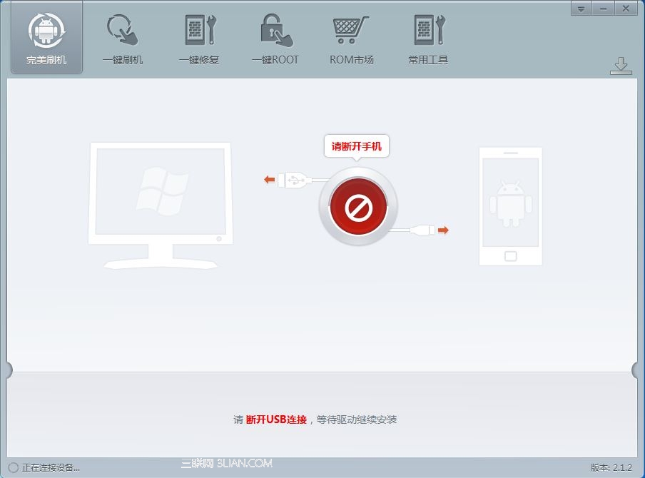 連上手機與電腦,打開完美刷機軟件等待設備連接。