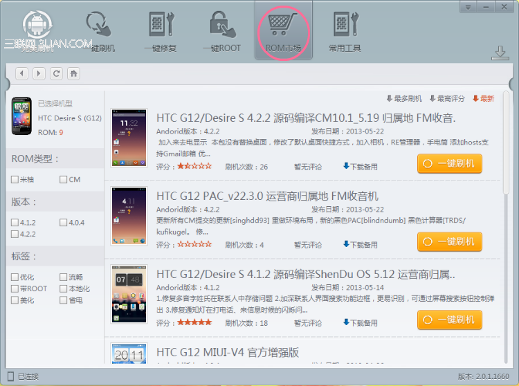 除此之外,你還可以直接點擊主頁面上方“rom市場”按鈕,搜索中意的HTC G12刷機rom下載進行刷機。