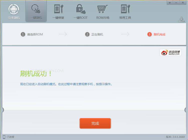 刷機軟件此時頁面如下圖所示,軟件提示你已經為HTC Desire S G12完成刷機工作,請點擊“完成”,之後同樣不要移動手機,等待手機自動重啟。
