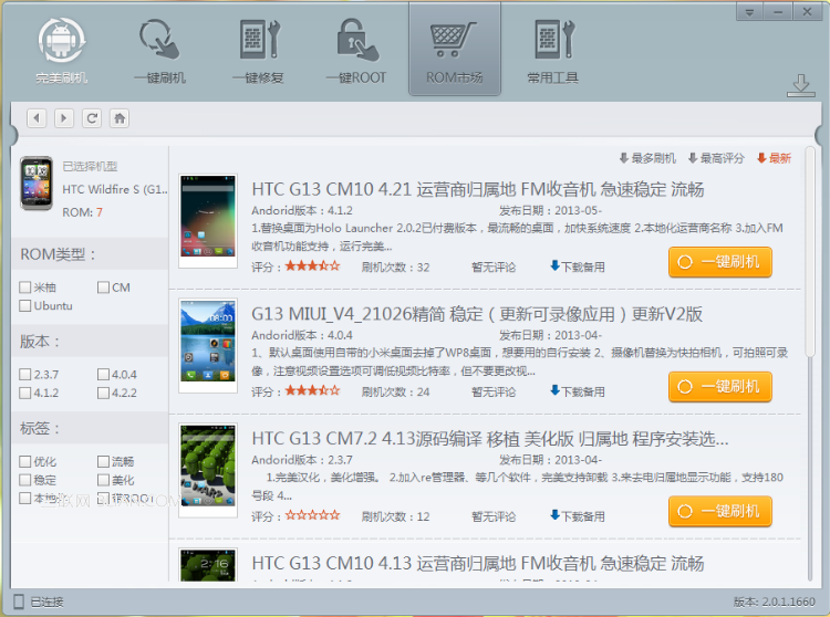 除此之外,你還可以直接點擊主頁面上方“rom市場”按鈕,搜索中意的g13 rom下載進行刷機。