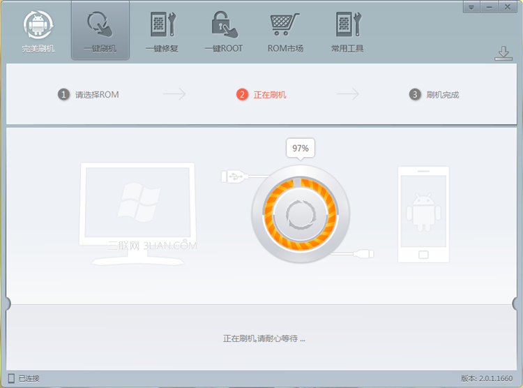 HTC g17自動刷機過程正式開始,這是HTC g17刷機教程關鍵步驟,刷機軟件運行需要5—10分鐘,在這段時間裡不要對手機進行任何額外操作,比如移動和觸碰!
