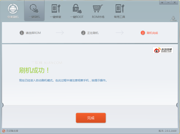 當刷機軟件此時頁面如下圖所示時表示這是HTC One X刷機教程最後一個步驟,HTC One X刷機軟件運行結束,請點擊“完成”。