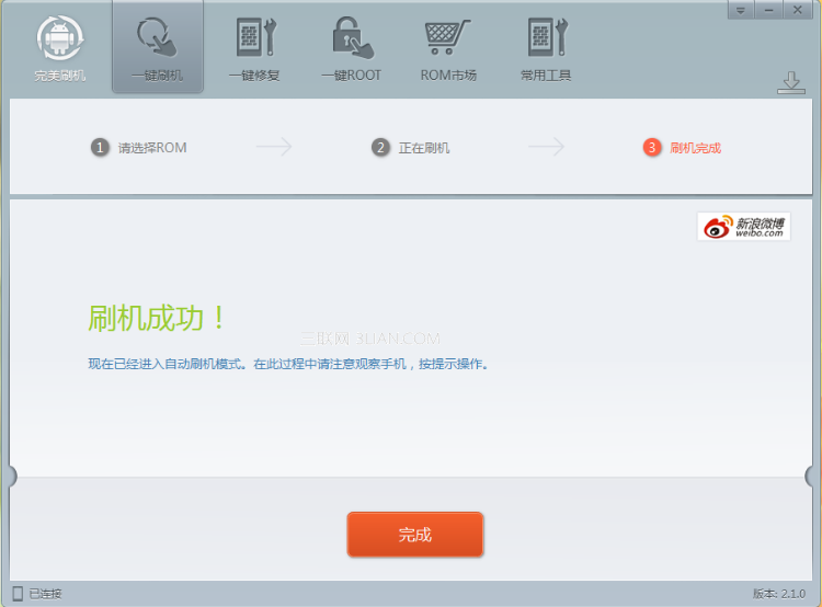 軟件工具條向前推進到“完成”,軟件提示你nexus4 4.3刷機成功,手機目前進入自動刷機模式,點擊“完成”,之後等待手機自動重啟。