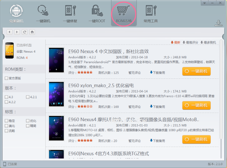 除此之外,你還可以直接點擊主頁面上方“rom市場”按鈕,搜索中意的nexus4 4.3 刷機rom下載進行刷機。