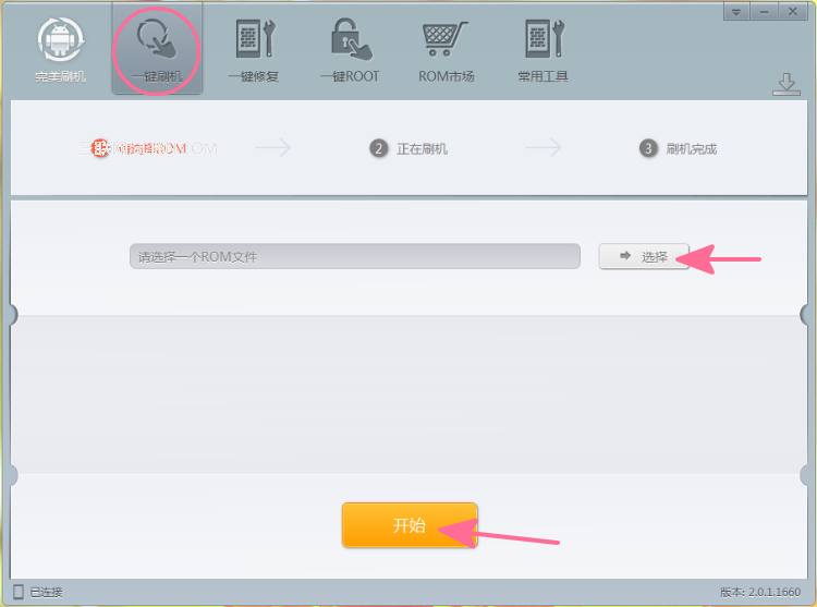 途徑二:如果刷機之前你就已經准備好nexus4 4.3刷機rom包,請直接切換至“一鍵刷機”頁面,點擊“選擇”,選定你已經准備好的rom包,點擊頁面下方的“打開”,將rom添加到主頁面的選項框後,點擊“開始”刷機軟件立即運行。