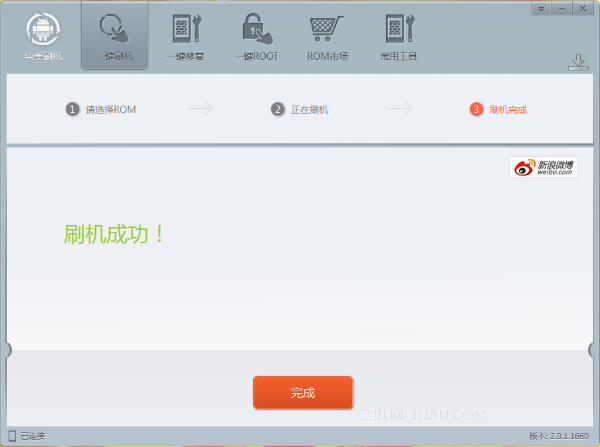三星i9020/9023刷機軟件此時頁面如下圖所示,刷機軟件提示你完成三星nexus s刷機工作,請點擊“完成”,之後同樣不要移動手機,請耐心等待手機自動重啟。
