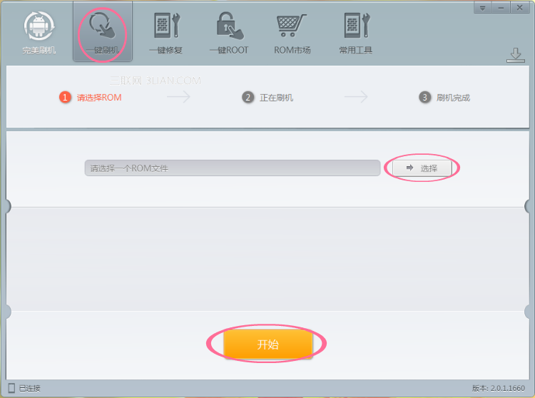 途徑二:如果刷機之前你就已經准備好三星e110S刷機包,請直接點擊主頁面的“一鍵刷機”按鈕,進入刷機頁面,點擊“選擇”,選定你已經准備好的三星e110S刷機包,點擊頁面下方的“打開”完成添加操作,點擊下方的“開始”按鈕,軟件立即運行三星e110S刷機。