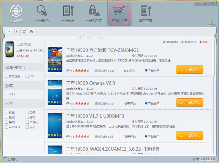 除此之外,你還可以直接點擊主頁面上方“rom市場”按鈕,搜索中意的三星galaxy s4刷機rom下載進行刷機。