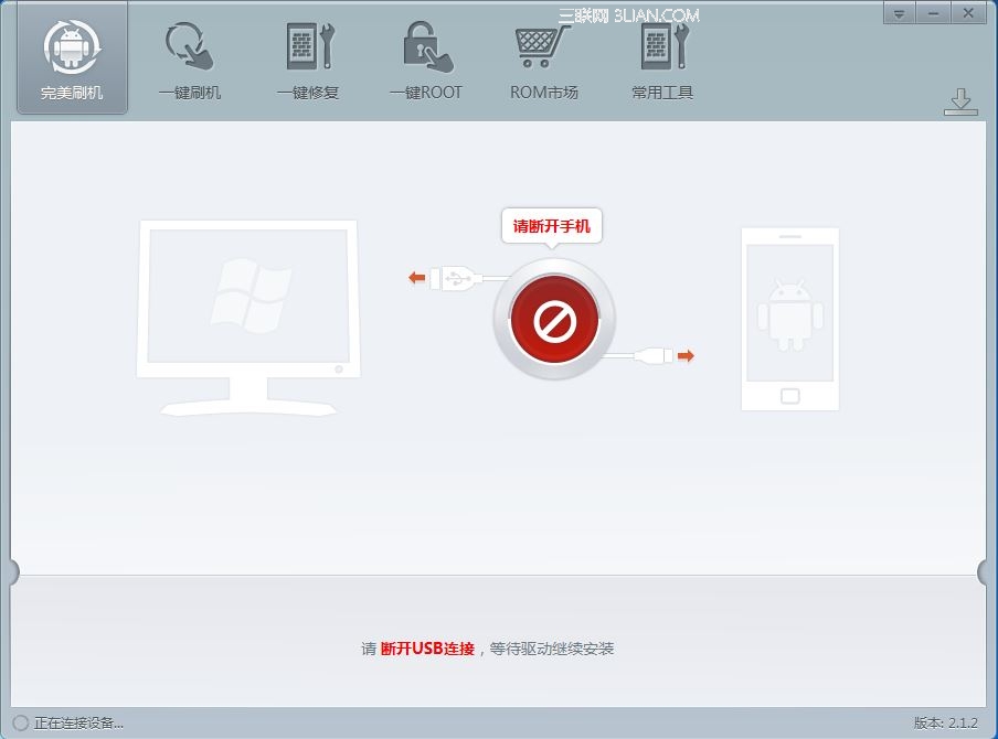 驅動裝好後再次提示連接手機設備,連接好手機,點擊確定按鈕,准備刷機了。