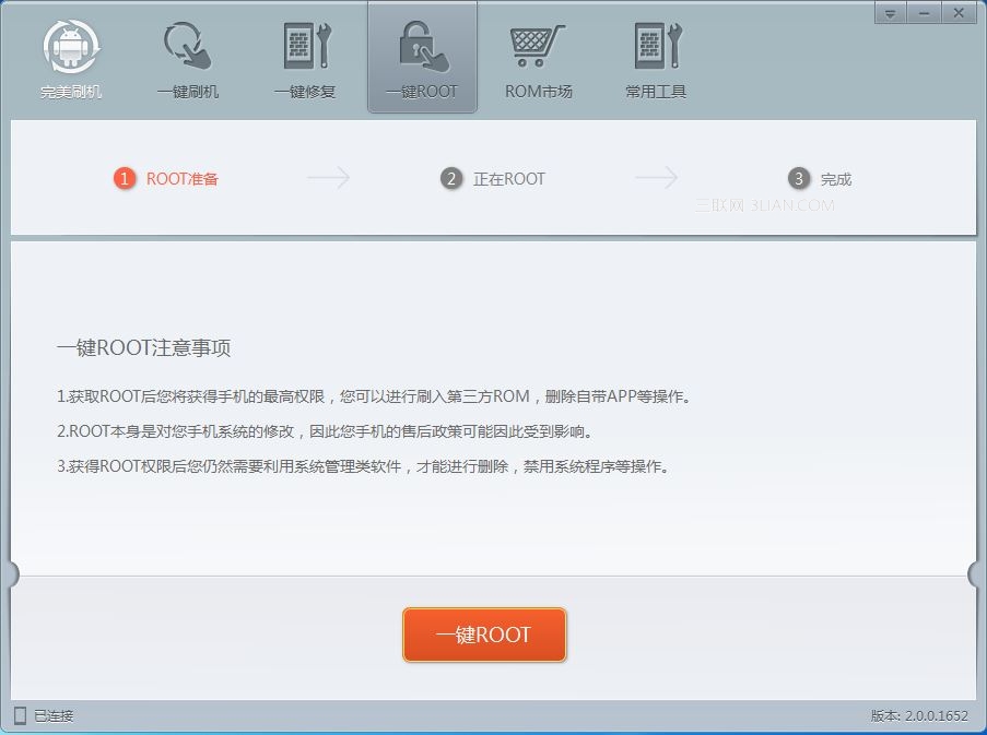 使用數據線連好手機和電腦,打開完美刷機讓軟件連接上手機設備,准備為Nexus4一鍵Root了。直接點解一鍵ROOT,利用一鍵Root獲取Nexus4最高權限。