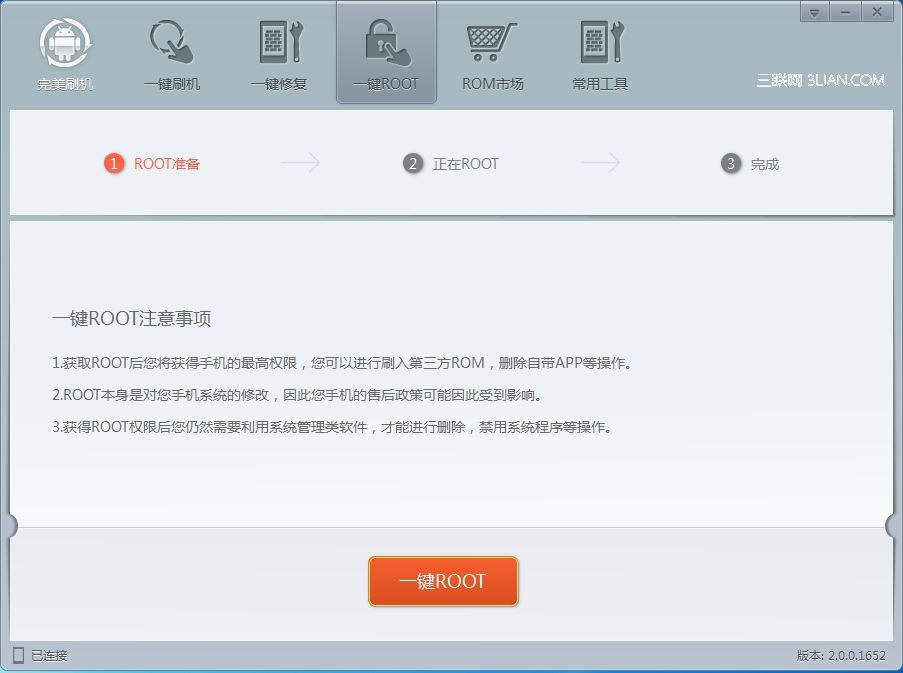 一鍵Root注意事項須知,ROOT後,獲取到手機的最高權限,可以刷三方ROM,刪APP。售後服務也將受到一定影響。確認Root後,請點擊一鍵Root按鈕。