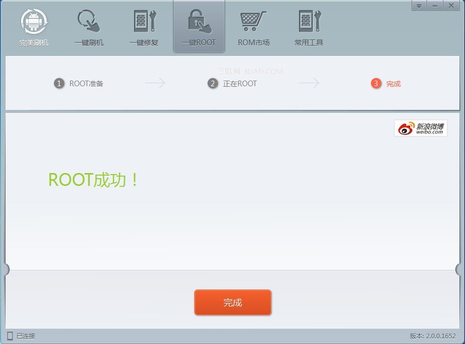 軟件顯示成功則表示Root步驟已完成。此時完成按鈕也由先前的灰色變為可點擊的綠色。鼠標點擊完成按鈕,關閉軟件。